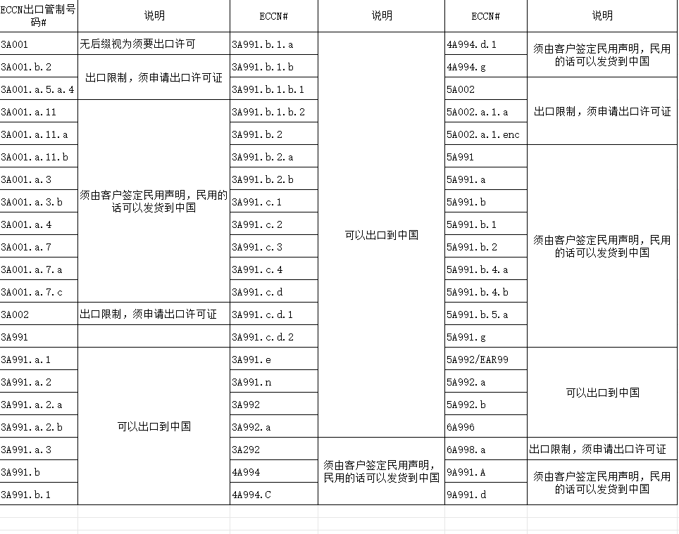 1、确定商品控制清单的ECCN出口分类号码,如果是EAR99,则不受控制。美国政府规定,任何供应商和原厂都有义务提供产品的ECCN编码。ECCN编码为五位数基码(如:5D992):